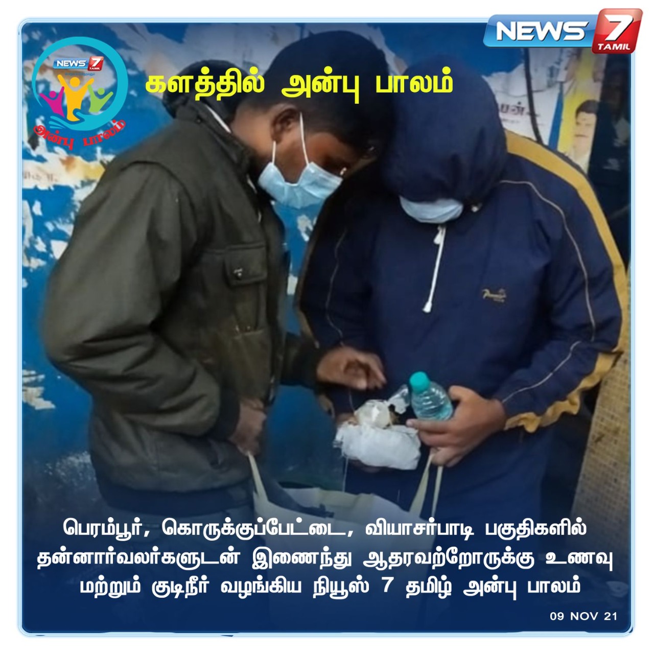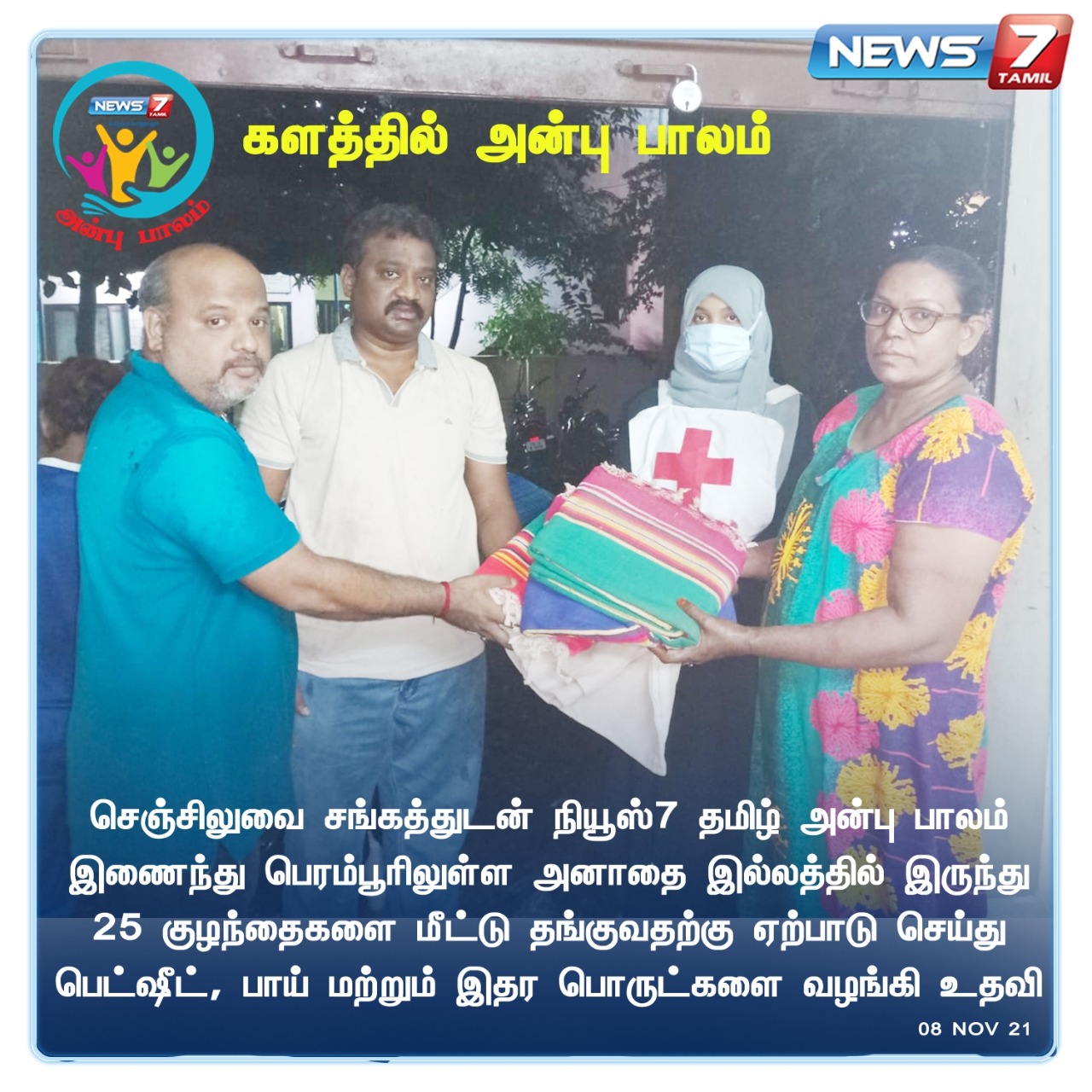 செஞ்சிலுவை சங்கத்துடன் நியூஸ் 7 தமிழ் அன்பு பாலம் இணைந்து பெரம்பூரிலுள்ள அனாதை இல்லத்தில் மழை வெள்ளத்தால் பாதிக்கப்பட்ட 25 குழந்தைகளை மீட்டு போர்வை மற்றும் பாய் உள்ளிட்ட பொருட்களை வழங்கி பாதுகாப்பான இடத்தில் தங்க வைக்கப்பட்டனர்.
