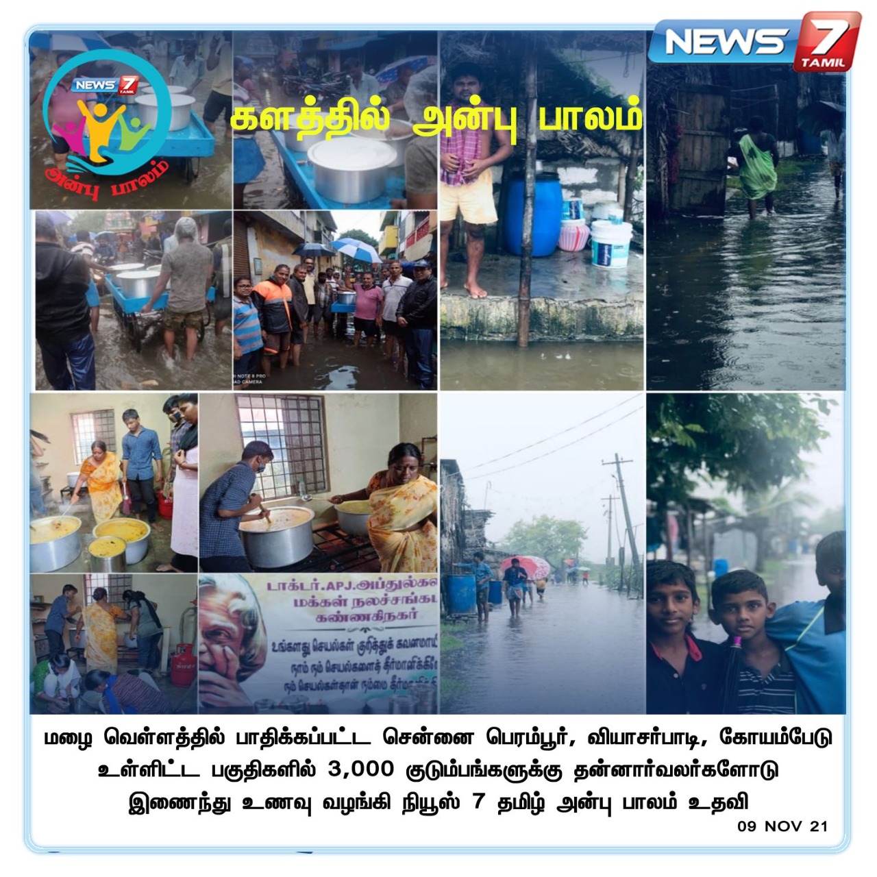மழை வெள்ளத்தில் பாதிக்கப்பட்ட சென்னை பெரம்பூர், வியாசர்பாடி, கோயம்பேடு உள்ளிட்ட பகுதிகளில் 3,000 குடும்பங்களுக்கு தன்னார்வலர்களோடு இணைந்து உணவு வழங்கி நியூஸ் 7 தமிழ் உதவி