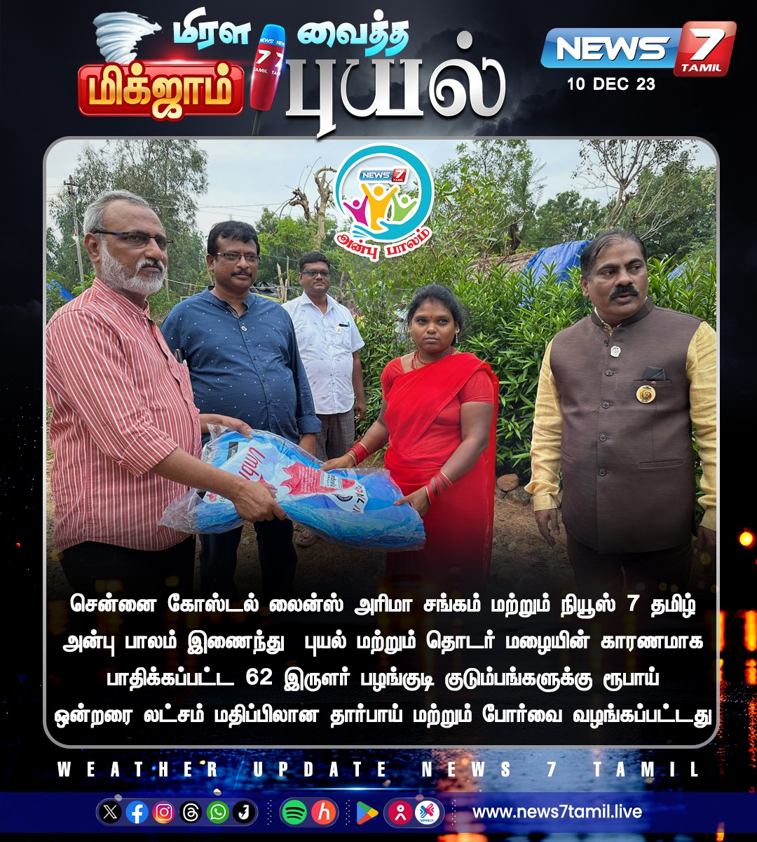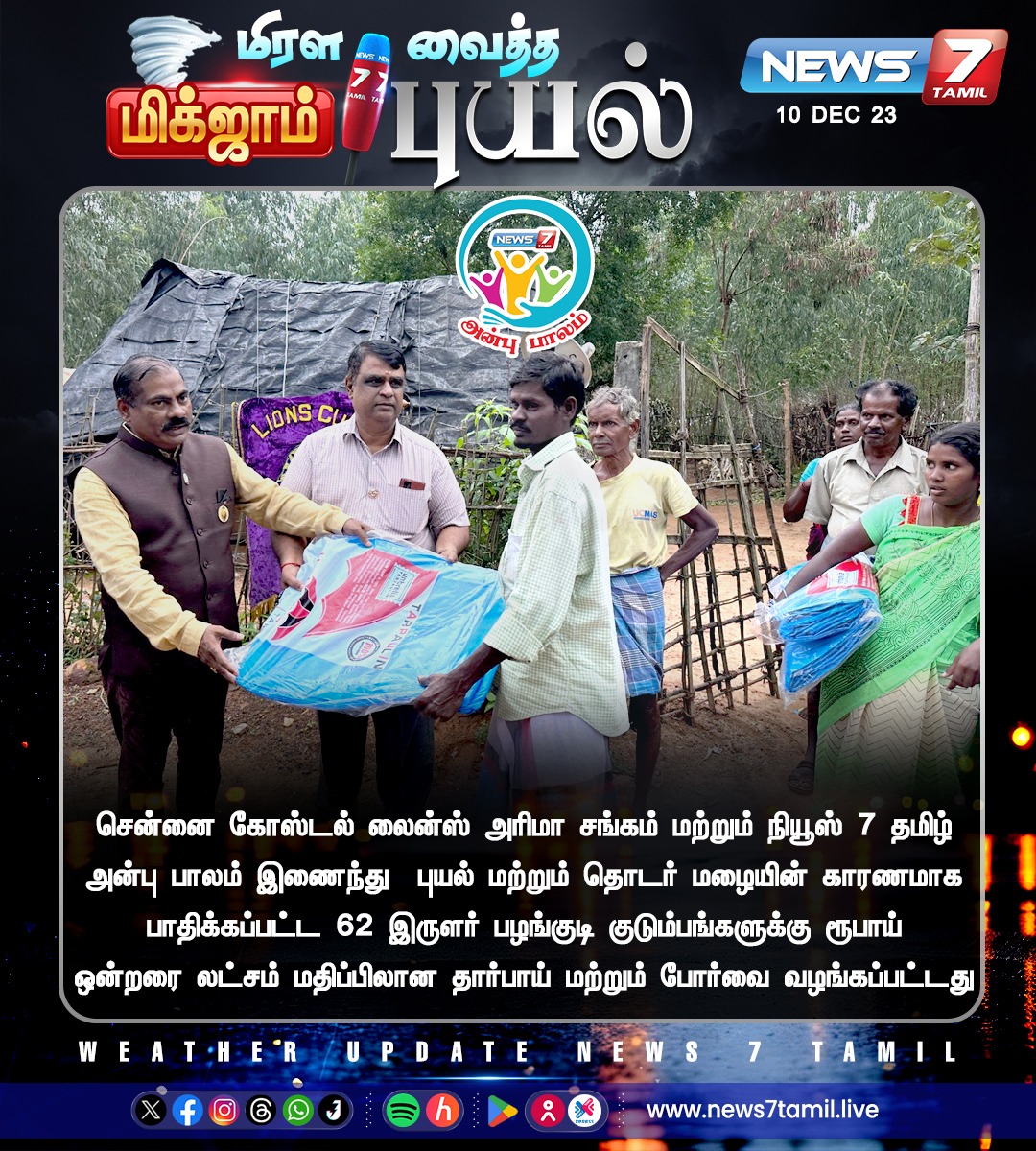 சென்னை கோஸ்டல் லைன்ஸ் அரிமா சங்கம் மற்றும் நியூஸ் 7 தமிழ் அன்பு பாலம் இணைந்து புயல் மற்றும் தொடர் மழையின் காரணமாக பாதிக்கப்பட்ட 62 இருளர் பழங்குடி குடும்பங்களுக்கு ரூபாய் ஒன்றரை லட்சம் மதிப்பிலான தார்பாய் மற்றும் போர்வை வழங்கப்பட்டது.