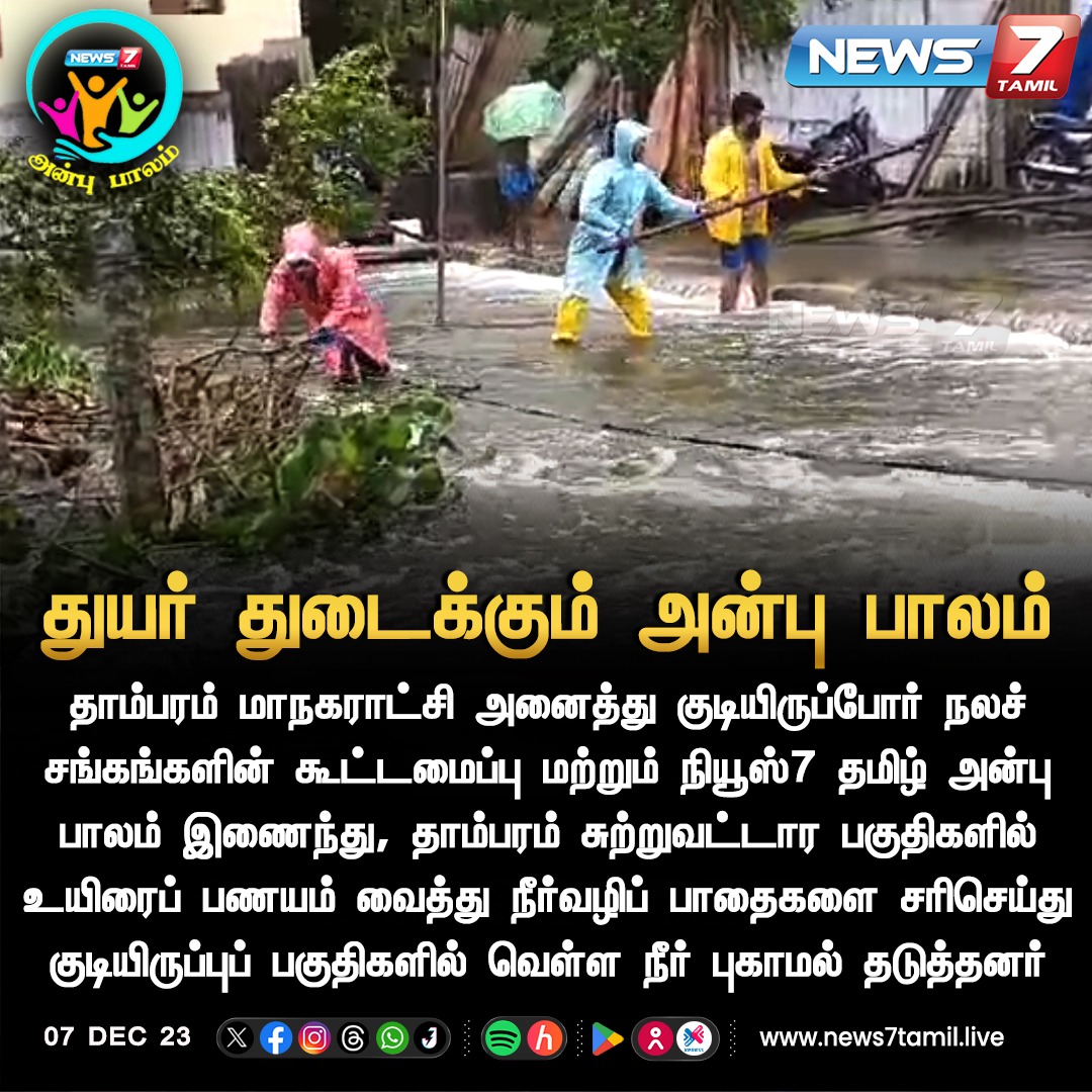 தாம்பரம் மாநகராட்சி அனைத்து குடியிருப்போர் நலச் சங்கங்களின் கூட்டமைப்பு மற்றும் நியூஸ்7 தமிழ் அன்பு பாலம் இணைந்து, தாம்பரம் சுற்றுவட்டார பகுதிகளில் உயிரைப் பணயம் வைத்து நீர்வழிப் பாதைகளை சரிசெய்து குடியிருப்புப் பகுதிகளில் வெள்ள நீர் புகாமல் தடுத்தனர்