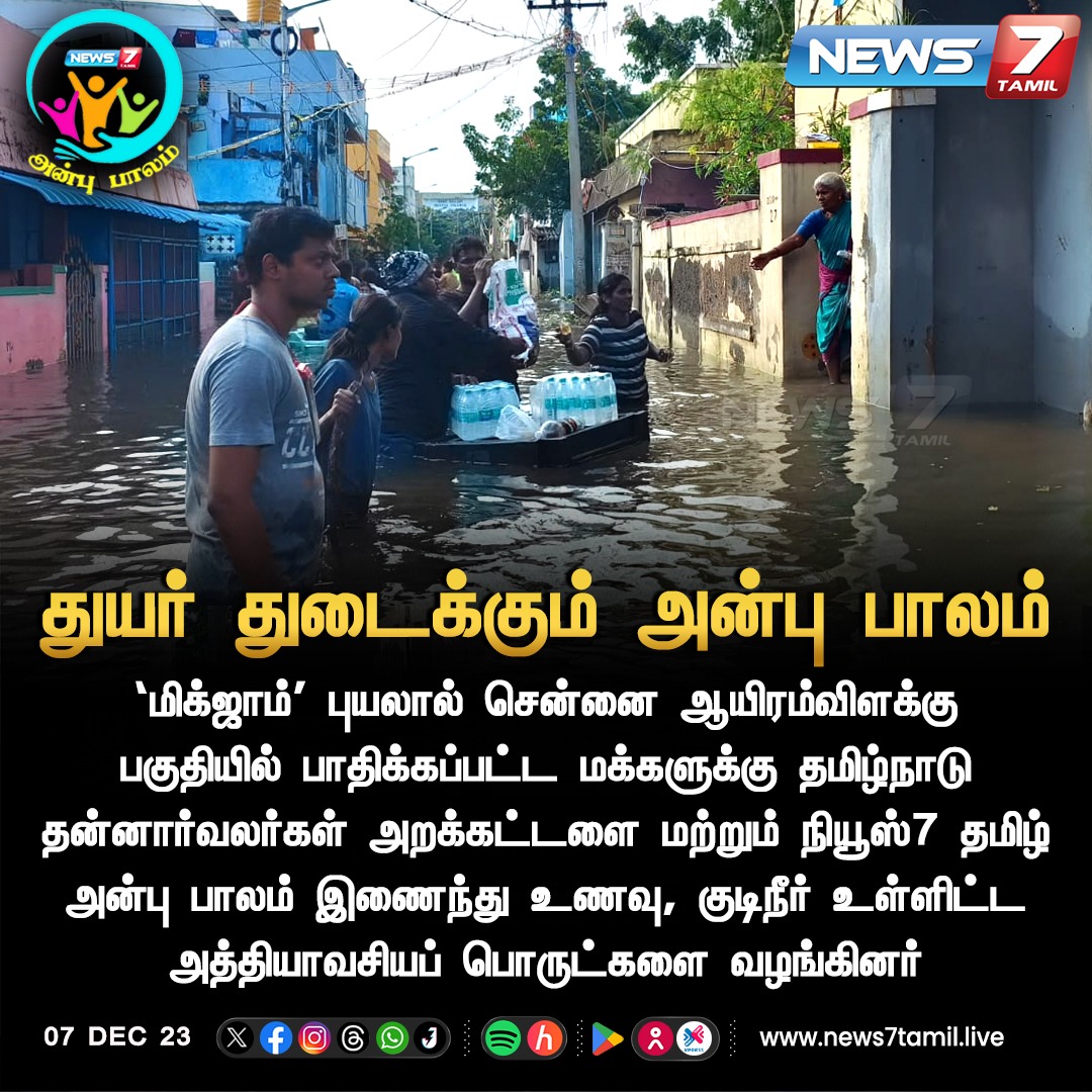 'மிக்ஜாம்' புயலால் சென்னை ஆயிரம்விளக்கு பகுதியில் பாதிக்கப்பட்ட மக்களுக்கு தமிழ்நாடு தன்னார்வலர்கள் அறக்கட்டளை மற்றும் நியூஸ்7 தமிழ் அன்பு பாலம் இணைந்து உணவு, குடிநீர் உள்ளிட்ட அத்தியாவசியப் பொருட்களை வழங்கினர்