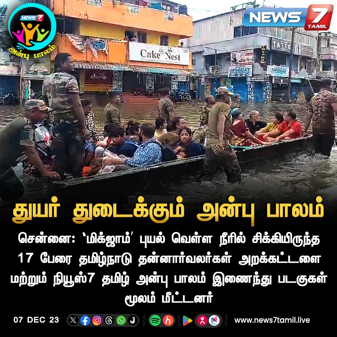 சென்னை: 'மிக்ஜாம்' புயல் வெள்ள நீரில் சிக்கியிருந்த 17 பேரை தமிழ்நாடு தன்னார்வலர்கள் அறக்கட்டளை மற்றும் நியூஸ்7 தமிழ் அன்பு பாலம் இணைந்து படகுகள் மூலம் மீட்டனர்