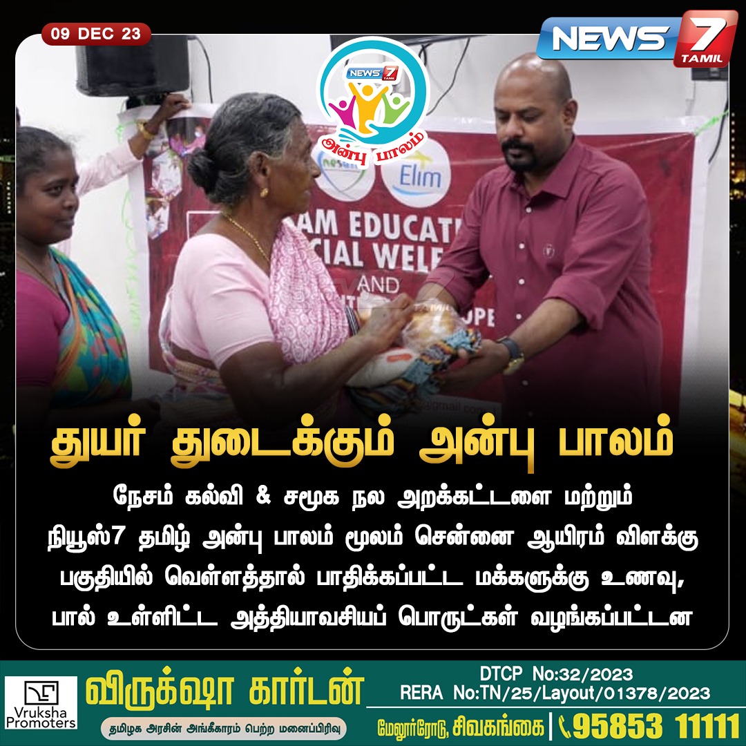 நேசம் கல்வி & சமூக நல அறக்கட்டளை மற்றும் நியூஸ்7 தமிழ் அன்பு பாலம் மூலம் சென்னை ஆயிரம் விளக்கு பகுதியில் வெள்ளத்தால் பாதிக்கப்பட்ட மக்களுக்கு உணவு, பால் உள்ளிட்ட அத்தியாவசியப் பொருட்கள் வழங்கப்பட்டன