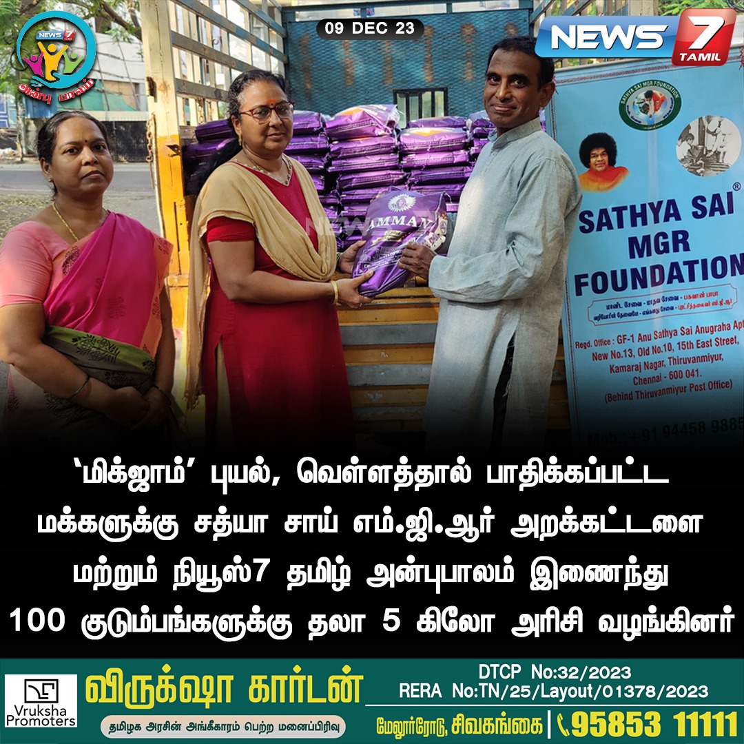 `மிக்ஜாம்' புயல், வெள்ளத்தால் பாதிக்கப்பட்ட மக்களுக்கு சத்யா சாய் எம்.ஜி.ஆர் அறக்கட்டளை மற்றும் நியூஸ்7 தமிழ் அன்புபாலம் இணைந்து 100 குடும்பங்களுக்கு தலா 5 கிலோ அரிசி வழங்கினர்